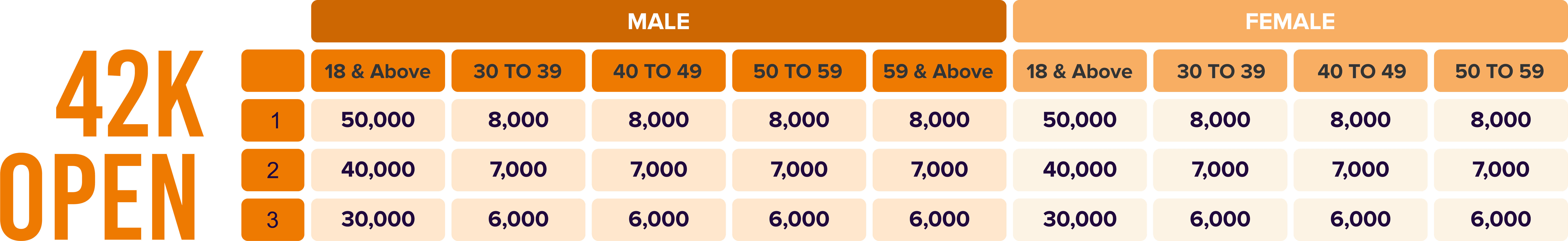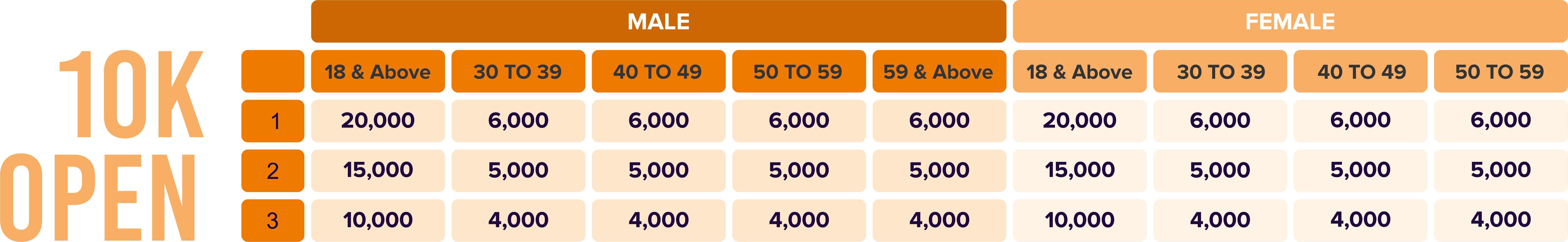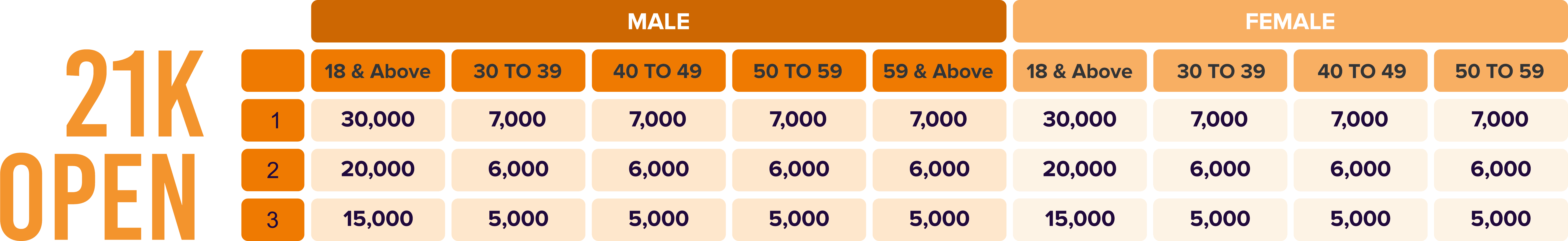 Age-category cash prizes will be awarded only if a minimum of 15 participants are registered in that category. If fewer participants are present, only 1 winner will be declared.